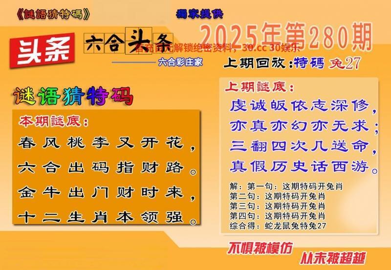 280期 春风桃李又开花 六合出码指财路 金牛出门财时来 十二生肖本领强 解译:春风桃李又开花指春肖兔虎龙,金牛出门财时来指明肖牛,金肖猴鸡 九肖:兔虎龙牛猴鸡猪狗鼠 |